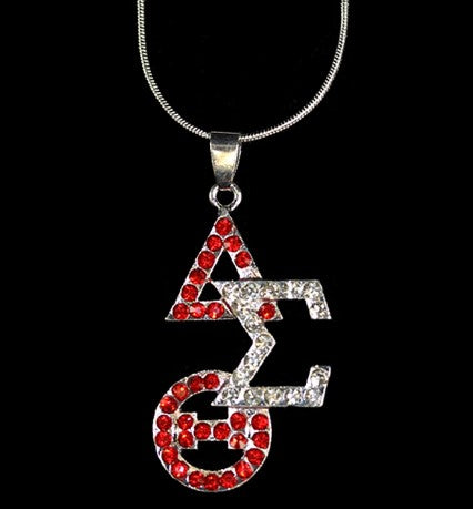 Delta Sigma Theta Crystal Necklace.  Silver-toned necklace with a red and clear crystal charm. Eye catching overlapping Greek letter design. 19" chain length with 1.5" tall charm.  A great gift for any soror!