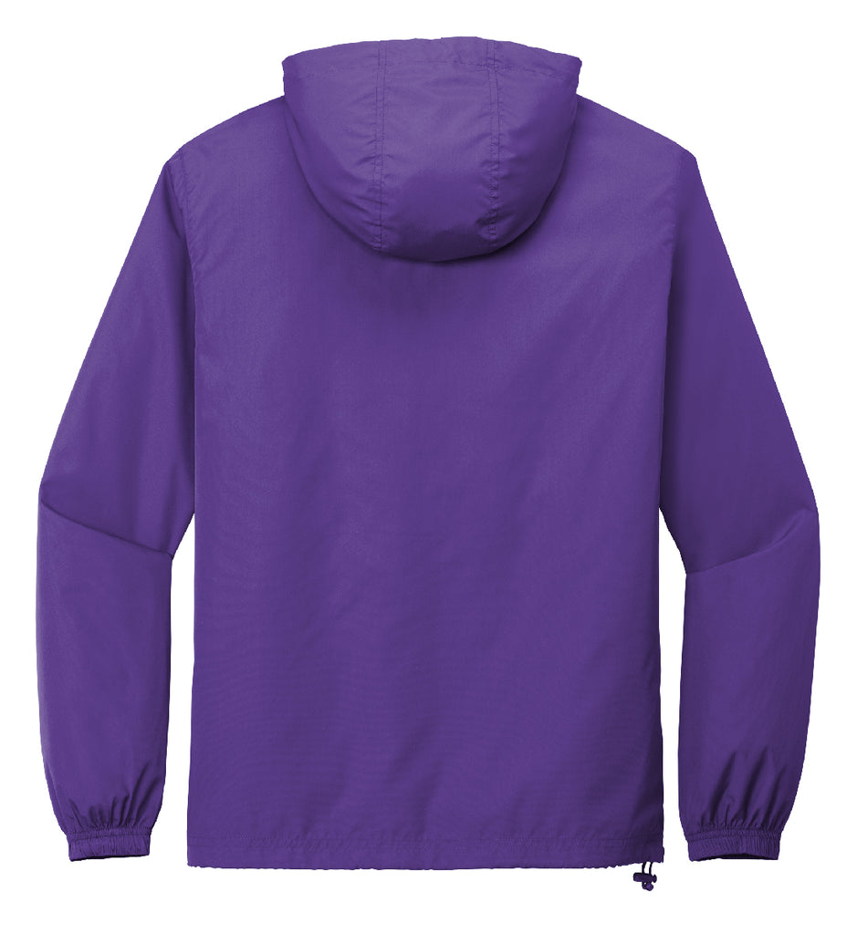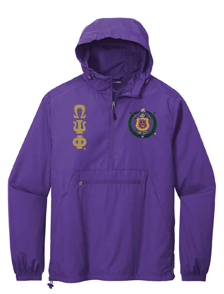 Omega Psi Phi Fraternity, Inc. solid purple anorak pullover hooded jacket. This jacket is fully embroidered with the Omega crest on the upper left chest and Greek Letters on the upper right.