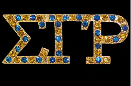 Sigma Gamma Rho Sorority, Incorporated 3 Letter Crystal pin. The pin features the Greek letters studded with blue and gold crystals on a silver or gold-toned base. A classy addition to any top or jacket.        Size: 2" wide, 3/4" tall