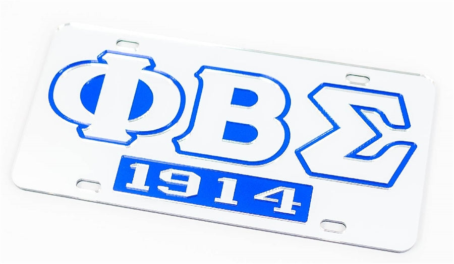 Phi Beta Sigma Fraternity, Incorporated mirrored vanity license plate. Silver with greek letters Phi Beta Sigma on top and the founding year 1914 at the bottom.